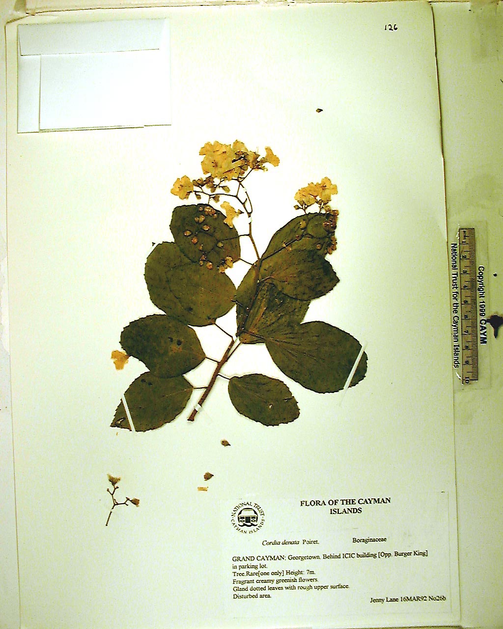 Large tree, height 7m Locally rare. Flowers green/cream. Gland dotted leaves.. Disturbed land